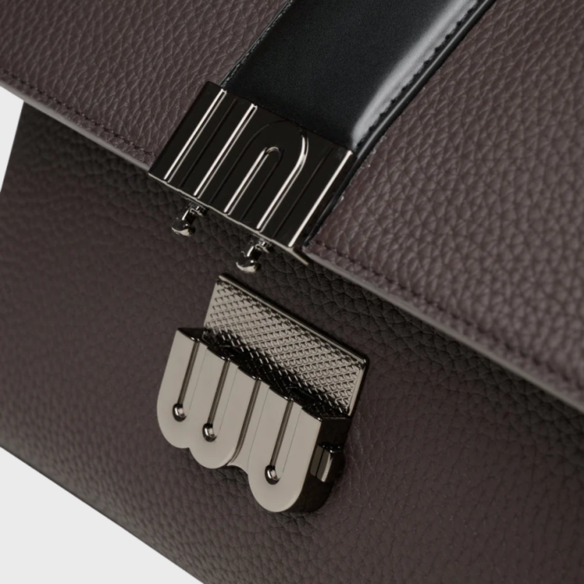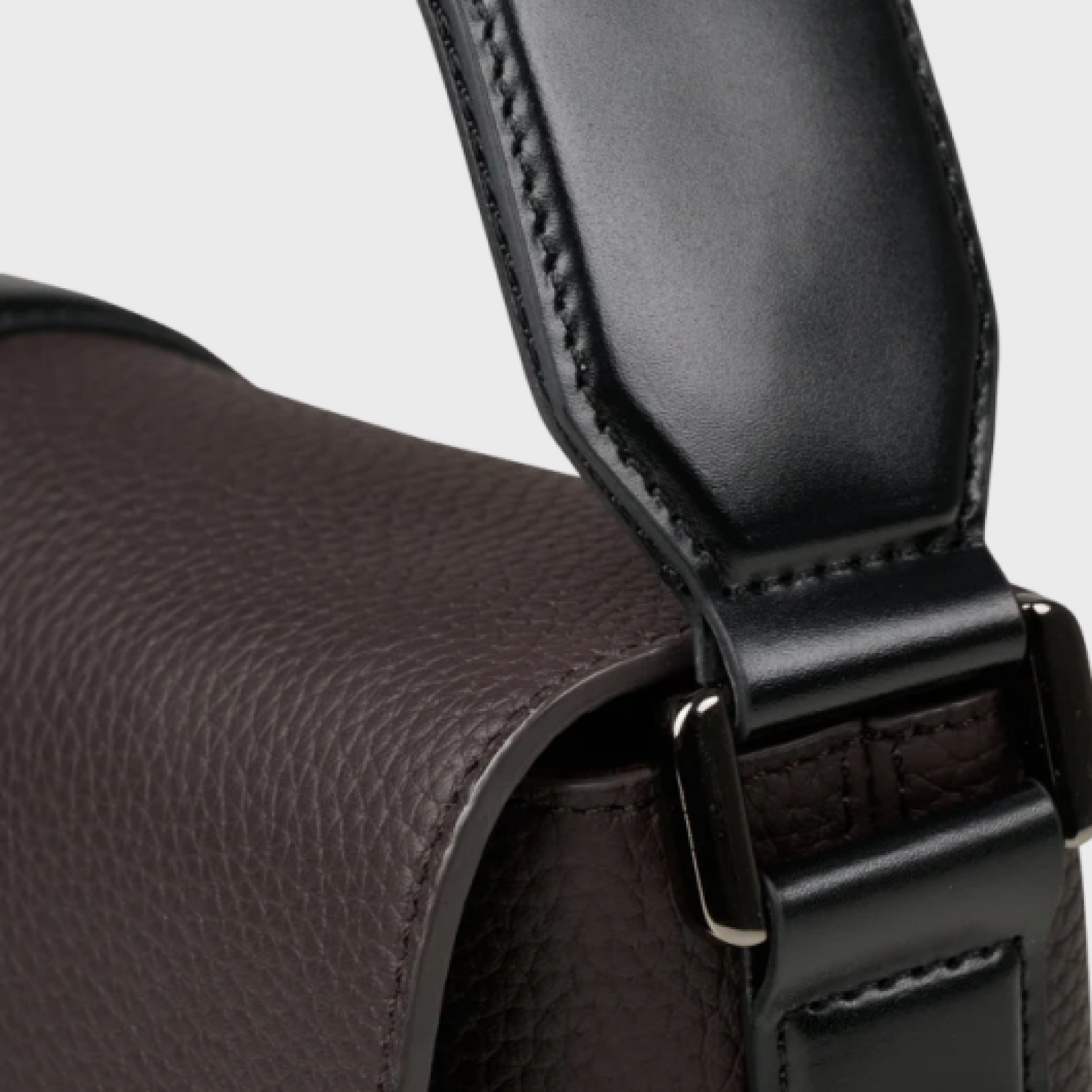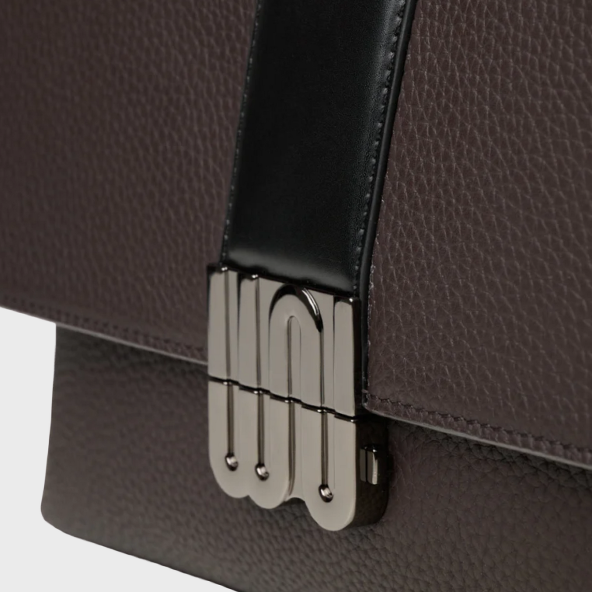 INSPIRED BY THE TYGAR STONE—SYMBOLIZING STRENGTH, GROUNDING, AND SHARP INSTINCT—THE TYGAR COCOA CARRIES THAT ENERGY IN A DEEP, REFINED SILHOUETTE. CRAFTED IN RICH COCOA LARGE-GRAIN EUROPEAN LEATHER AND CUT WITH A SMOOTH BLACK CONTRAST BAND, IT DELIVERS A BOLD, ARCHITECTURAL PRESENCE. FINISHED WITH HIGH-SHINE SILVER HARDWARE, IT STANDS AS A POWERFUL MODERN ESSENTIAL.