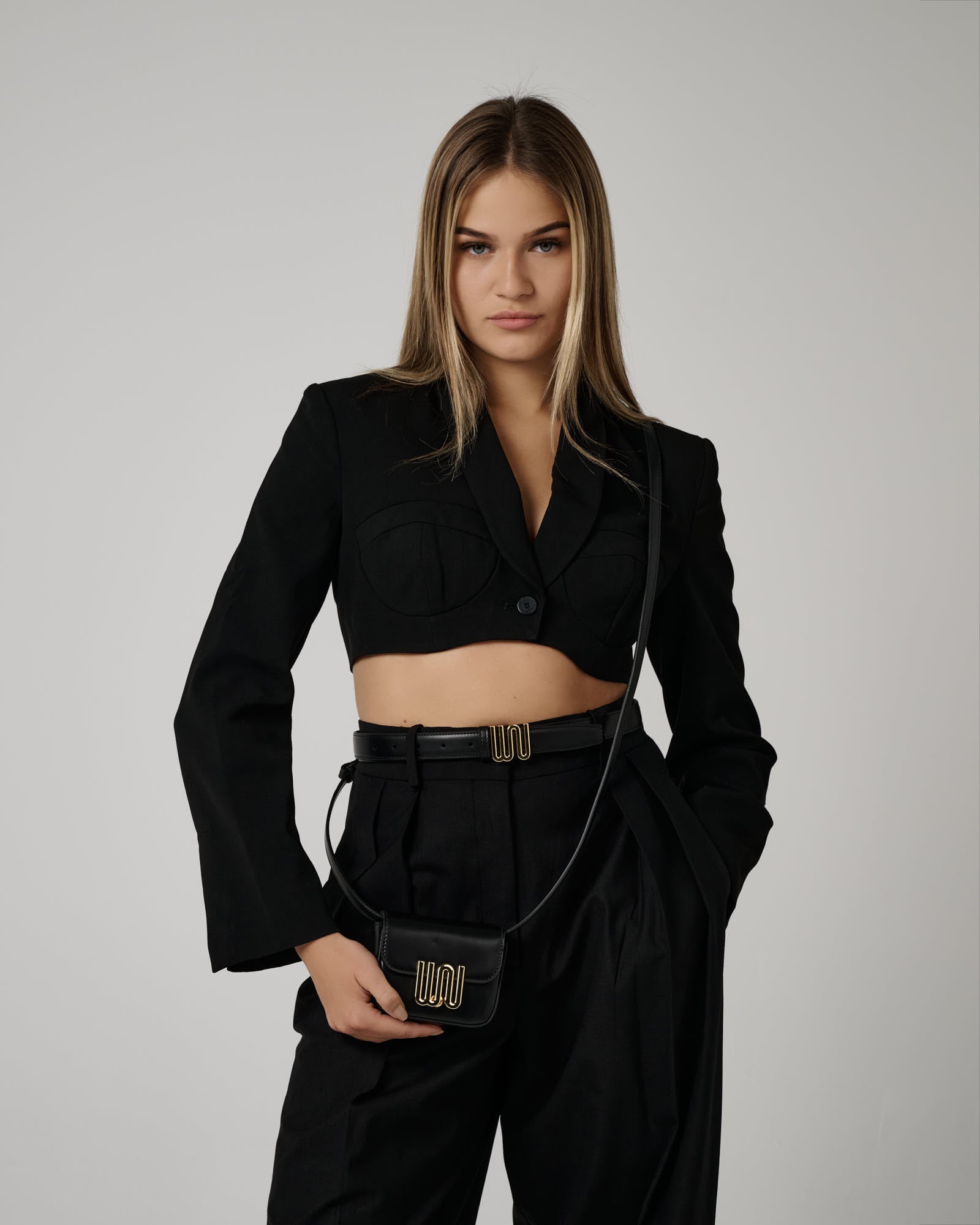A transformative belt bag in deep matte black leather with five-way convertible versatility and editorial sophistication. Infused with Agate's grounding energy—stability, balance, and protective strength—this piece anchors your presence with refined elegance and infinite styling possibilities. Five-way convertibility: wear as crossbody with leather strap, doubled around the waist, with gold chain strap, detachable gold hardware belt worn alone as jewelry, or combined with the bag; sculptural gold hardware makes it the ultimate day-to-evening essential; a reminder to move through the world with grounded power and fearless style.