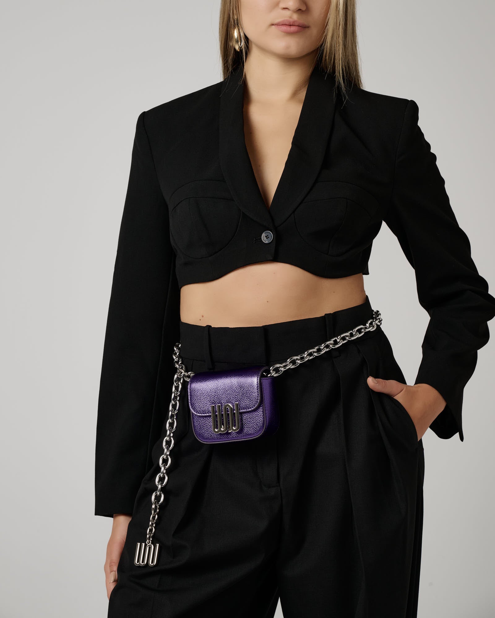 A transformative belt bag in metallic lavender leather with five-way convertible versatility and editorial sophistication. Infused with Agate's grounding energy—stability, balance, and protective strength—this piece anchors your presence with refined elegance and infinite styling possibilities. Five-way convertibility: wear as crossbody with leather strap, doubled around the waist, with silver chain strap, detachable silver hardware belt worn alone as jewelry, or combined with the bag; sculptural silver hardware makes it the ultimate day-to-evening essential; a reminder to move through the world with grounded power and fearless style.